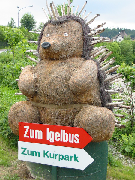 Überdimensionaler Igel als Wegweiser zur Haltestelle der Igel-Busse.